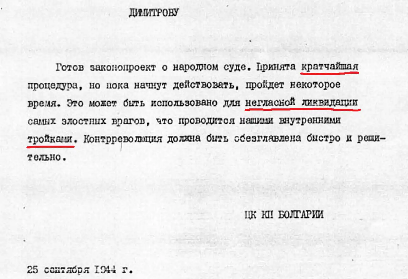 Писмо с дата 25 септември 1944, от ЦК на Българската комунистическа партия до Г. Димитров: „Готов е законопроектът за Народния съд. Приета е най-кратката процедура, но докато започне да действа ще измине известно време. Това може да бъда използвано за негласна ликвидация на най-злостните врагове, което се възлага на нашите вътрешни тройки“ (бойни групи от по три човека).