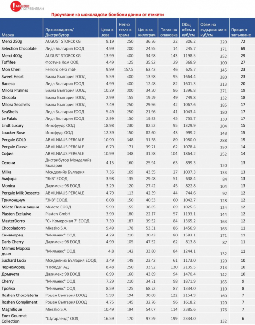 Затова от „Активни потребители“ решават да проверят съотношението на обема на кутията на бонбоните и обема на самите бонбони и да подредим резултатите, така че да се получи снимка на пазарната ситуация.