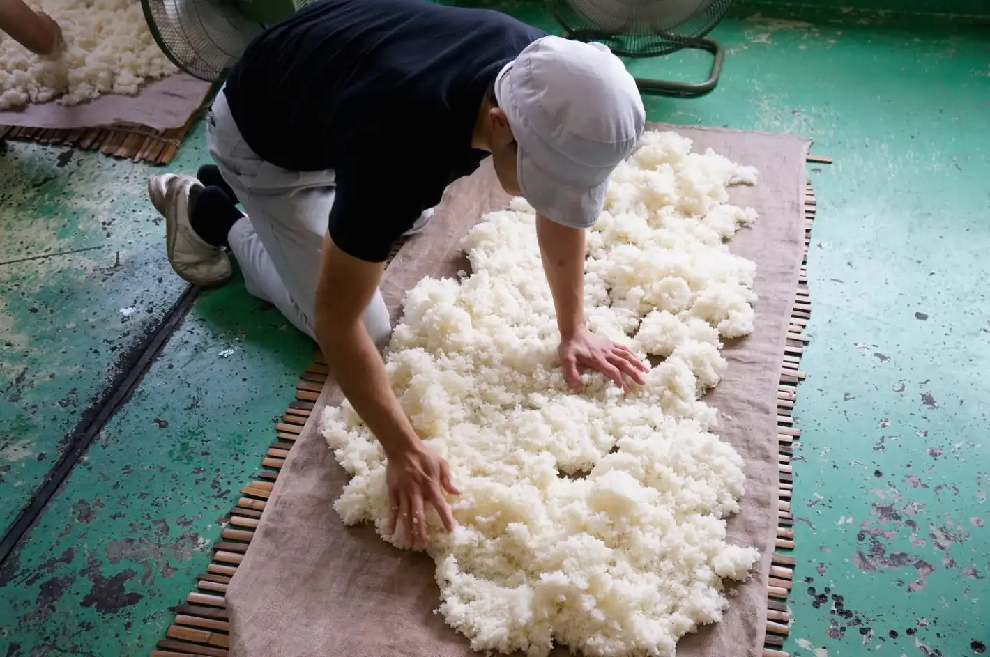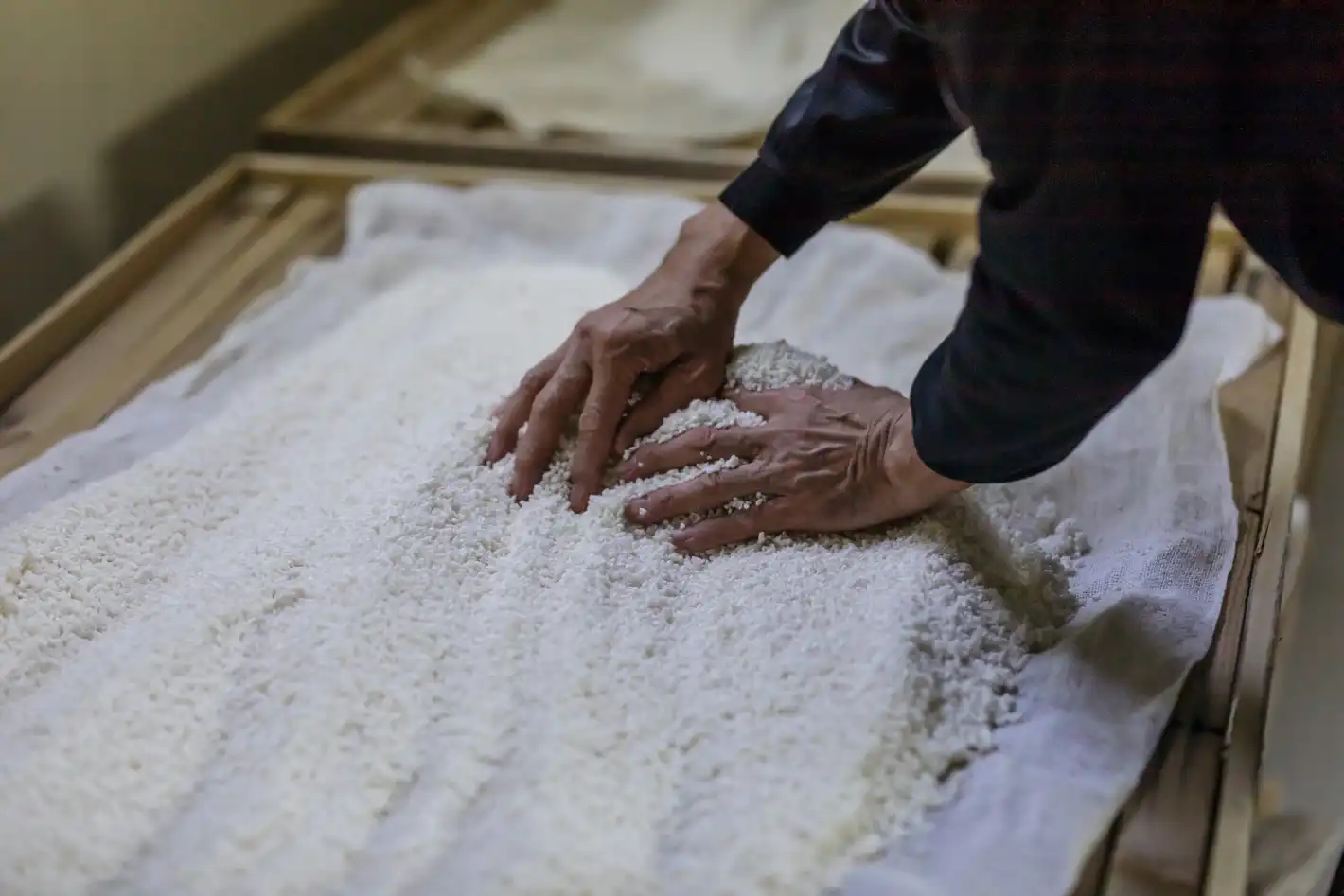 - Водата се използва при процеса. Не е разделена на части. Имаме ориз, в който нямаме никаква захар в него. Първо измиваме ориза (полира се, като се премахват външните слоеве – бел. а.) и го варим на пара, след това го поръсваме с „коджи“. Плесента разгражда нишестето в ориза до захари. След това добавяме дрожди, които ферментират захарта в алкохол.