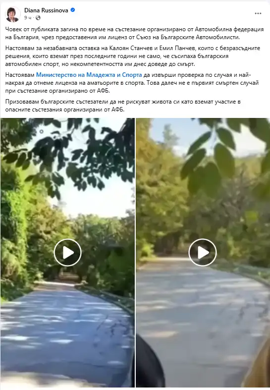 "Настоявам за незабавната оставка на Калоян Станчев и Емил Панчев, които с безразсъдните решения, които взимат през последните години, не само, че съсипаха българския автомобилен спорт, но некомпетентността им днес доведе до смърт", пише Русинова във фейсбук профила си.