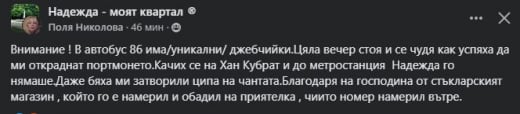 „Внимание! В автобус 86 има /уникални/ джебчийки. Цяла вечер стоя и се чудя как успяха да ми откраднат портмонето.
