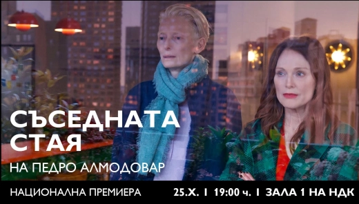 След церемонията на 25 октомври /петък/ в зала 1 на НДК от 19.00 ч. приятелите на „седмото изкуство” ще гледат камерната драма „Съседната стая”. Именно тази испанско –американска творба на прочутия режисьор Педро Алмодовар /за първи път на английски език/, в която блестят Джулиан Мур и Тилда Суинтън, грабна тази година „Златния лъв” от елитния Международен филмов фестивал във Венеция.