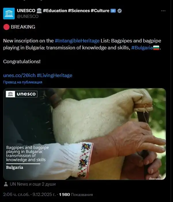 Съобщението гласи: „Нов запис в Списъка на #нематериалното културно наследство: Гайди и гайдарство в България: предаване на знания и умения, #България. Поздравления!“