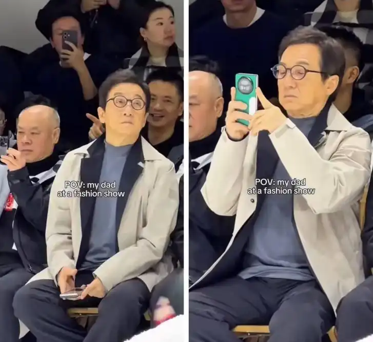 Джеки Чан присъства на модното събитие, облечен в стилно светло палто, което съчетава с тъмни панталони и сив пуловер. Той е сложил очила с кръгли лещи и спретнато е сресал гъстата си коса, чийто обем особено впечатли мнозина.