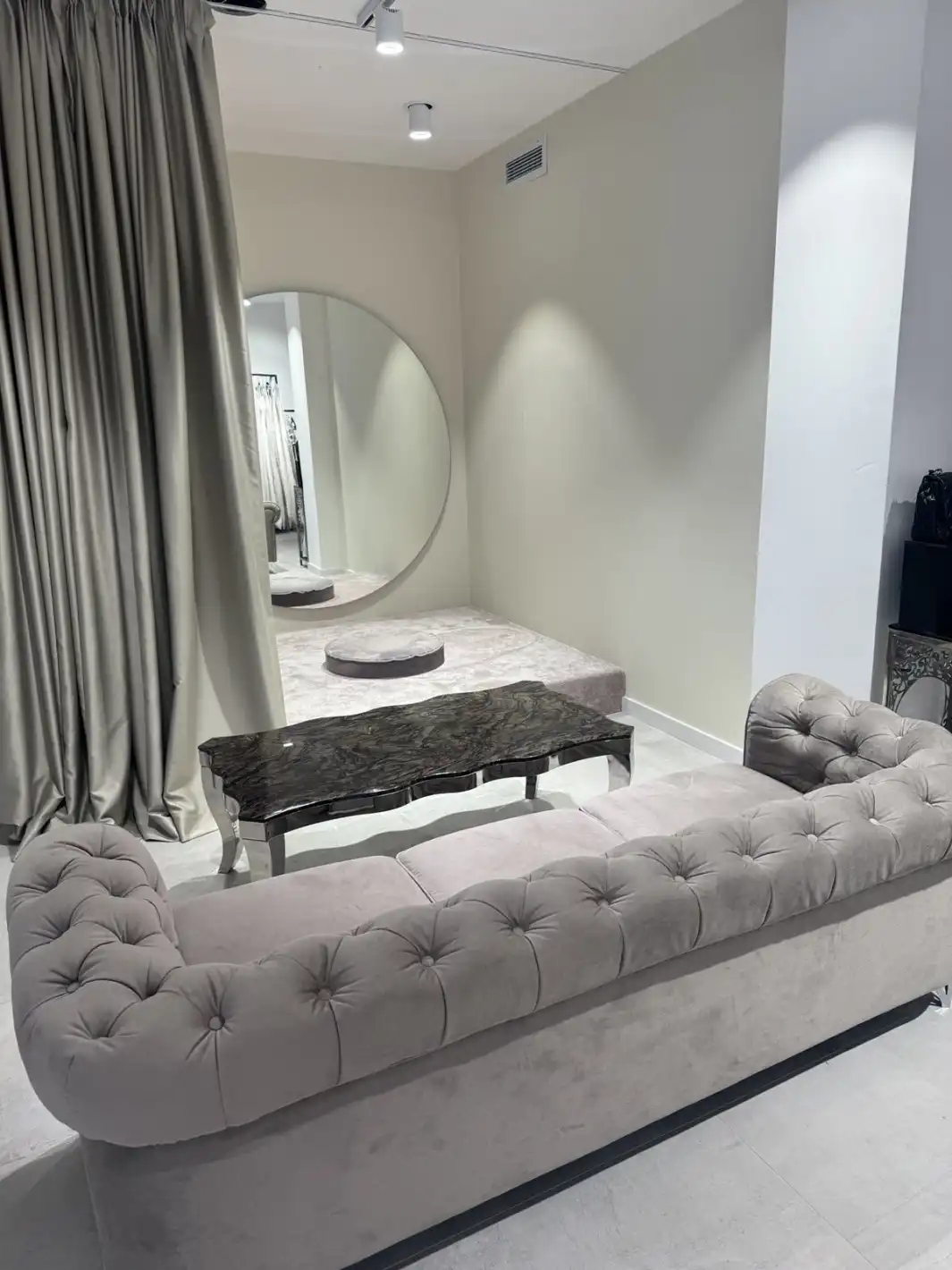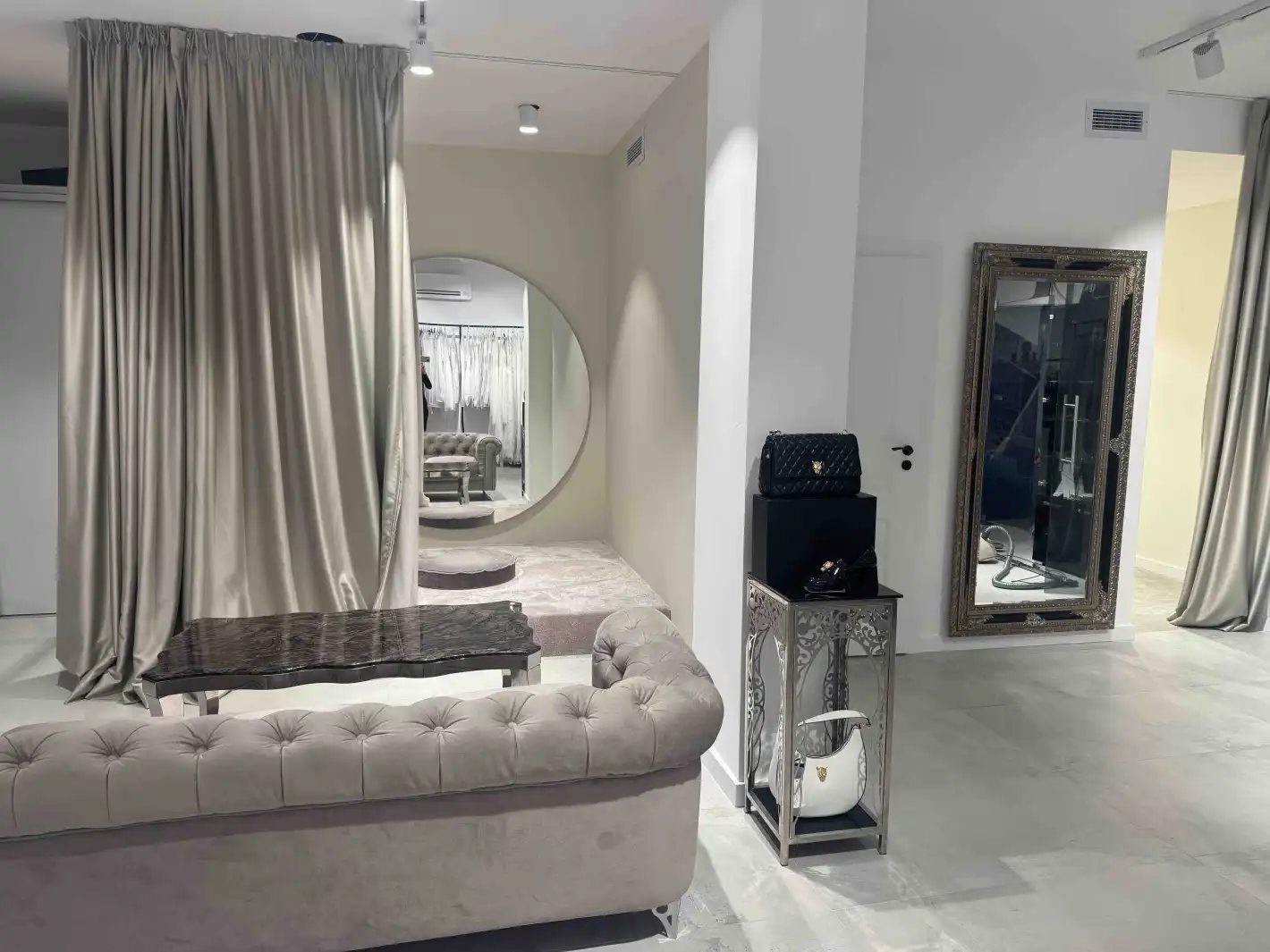 Дизайнът на бутика е съобразен с последните световни тенденции за пространства, където се предлагат булчински, официални рокли, бизнес тоалети и аксесоари.