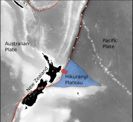 Скорошно сеизмично проучване (червена кутия) от Института по геонауки на Тексаския университет показа как платото се потапя в зоната на субдукция Хикуранги в Нова Зеландия (червена линия) Снимка: Андрю Гасе