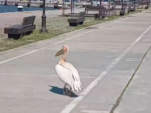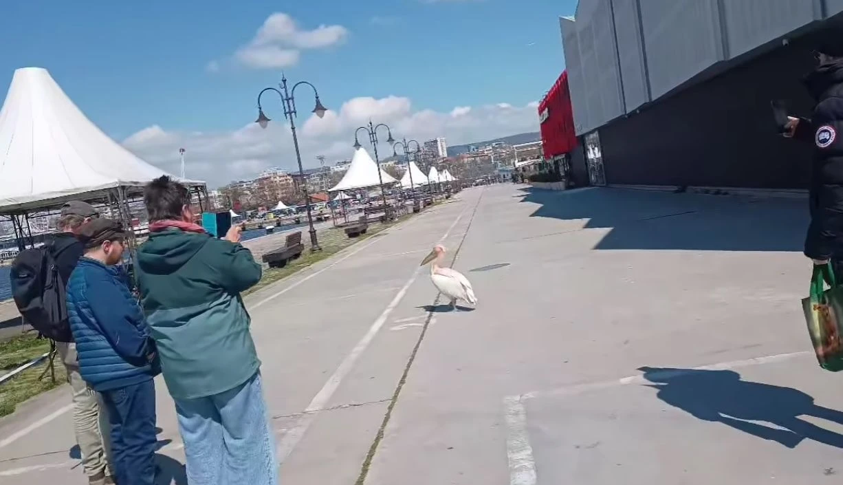 Разхождащи се покрай морето варненци бяха приятно изненадани от неочаквана компания. Редом с тях крачеше пеликан.