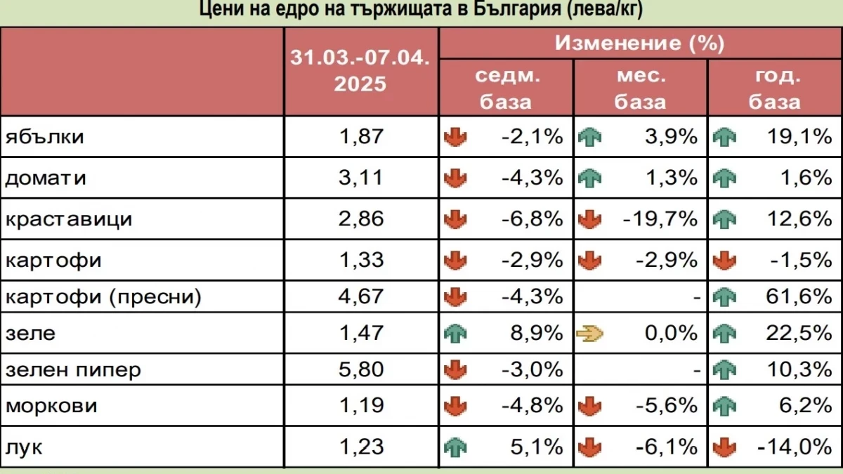 По информация на Министерство на земеделието и храните, базирана на данни от Държавната комисия по стоковите борси и тържищата, в периода 31 март - 07 април, средната едрова цена на пресните картофи на тържищата в страната е 4,67 лв./кг. На седмична база това е намаление с 4,3 %, но на годишна база има скок с 61,6 %.