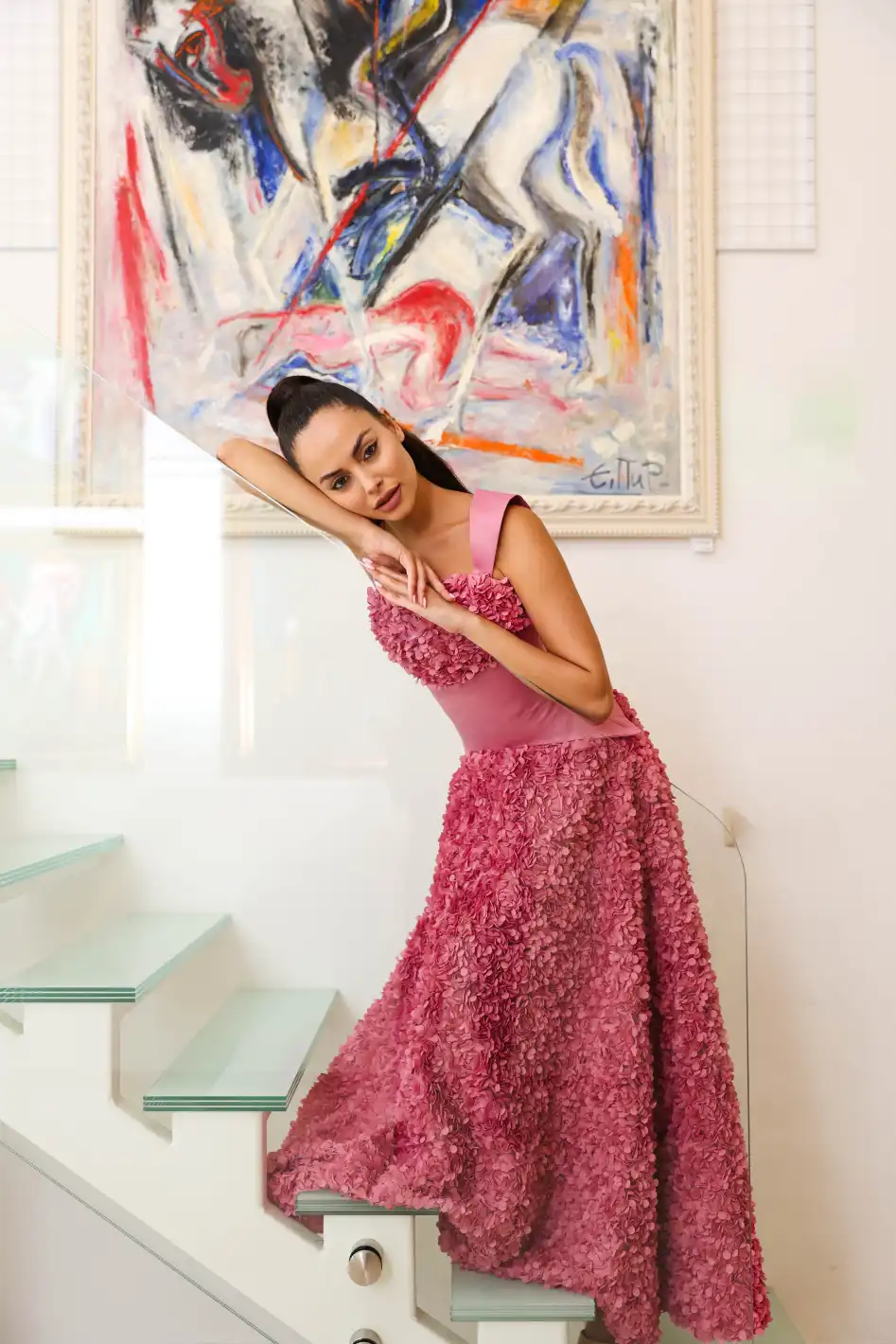 Нежно розовият ѝ нюанс, в съчетание със сатенен корсет, който силно подчертава талията и изящни 3D флорални елементи, създават усещане за движение, грация и мечтателна женственост. Именно тази рокля бе избрана да блести и на страниците на авторитетното издание L’Officiel Monaco.