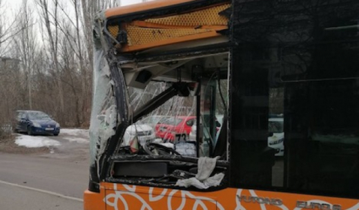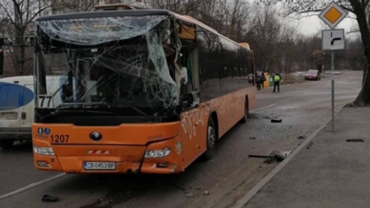 Предното стъкло на автобуса по линия 77 е счупено. Леко пострадали са шофьора на автобуса и лекия автомобил.