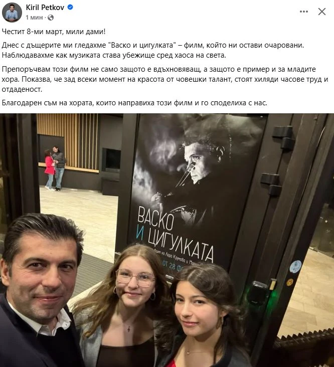 "Днес с дъщерите ми гледахме "Васко и цигулката" – филм, който ни остави очаровани" - поясни той, но от фотоса, който сподели, ясно се вижда, че от компанията им липсва съпругата на Петков - Линда.