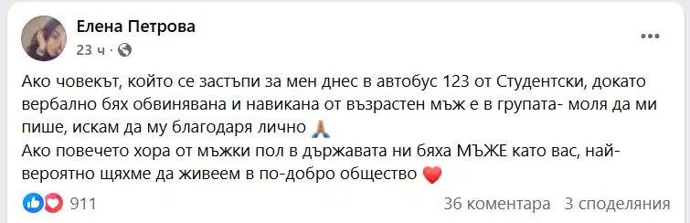 "Ако човекът, който се застъпи за мен днес в автобус 123… е в групата, моля да ми пише. Искам да му благодаря лично. Ако повечето хора от мъжки пол в държавата ни бяха МЪЖЕ като вас, най-вероятно ще живеем в по-добро общество", пише жената.