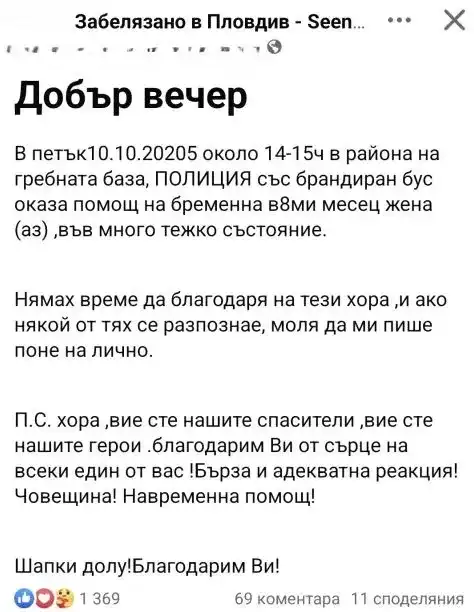 Майката сподели в социалните мрежи думи на благодарност към служителите на реда, помогнали ѝ в трудния момент. В поста ѝ ясно личат вълнение и признателност за проявената съпричастност и човечност.