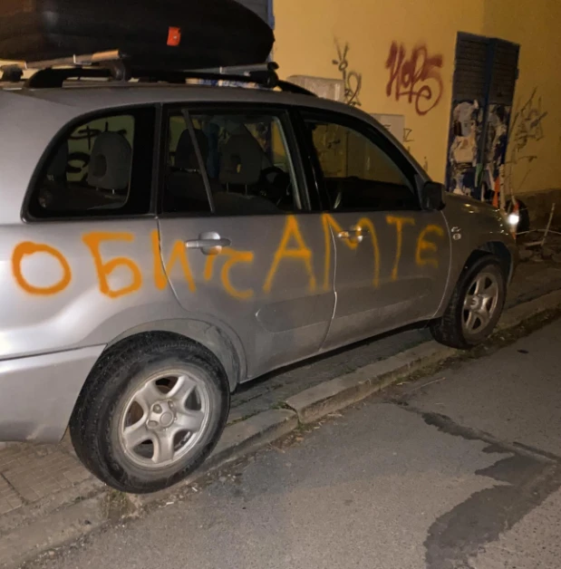 Сребрист автомобил Toyota RAV4 стана обект на вандалска проява в столичния квартал „Младост“. Возилото е било „разкрасено“ с оранжев спрей, като върху предния капак и страничната му част е изписано „Обичам те“.