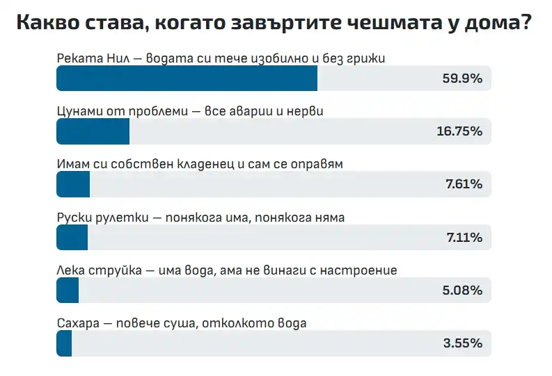 59.9% твърдят, че от чешмите им тече реката Нил - изобилно и без грижи. 16.75% от читателите ни алармират за цунами от проблеми - все аварии и нерви.