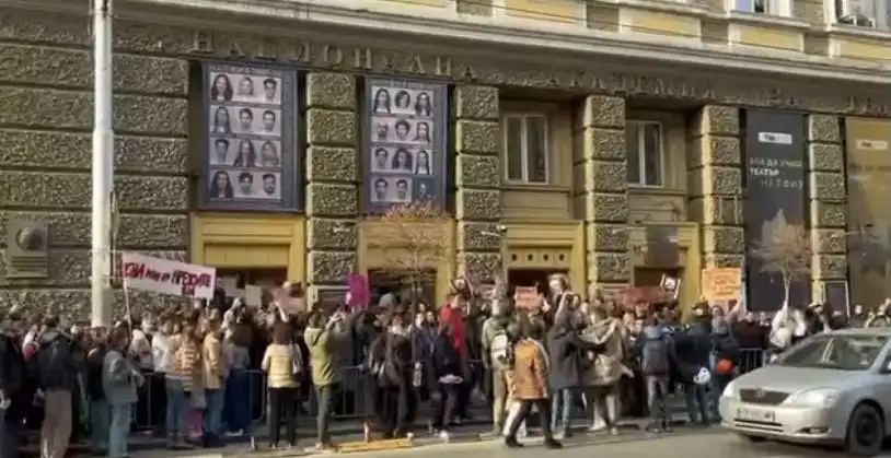 Началото на шествието бе пред НАТФИЗ, където група млади хора с плакати скандираха "Оставка!".