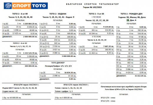 В играта "6 от 49" на Тото 2 има нов милионер. В тираж 102 игралият печели 3 269 864 лв.
