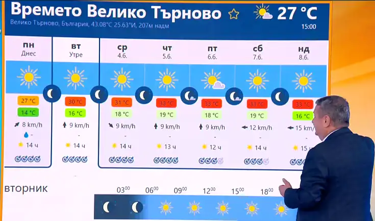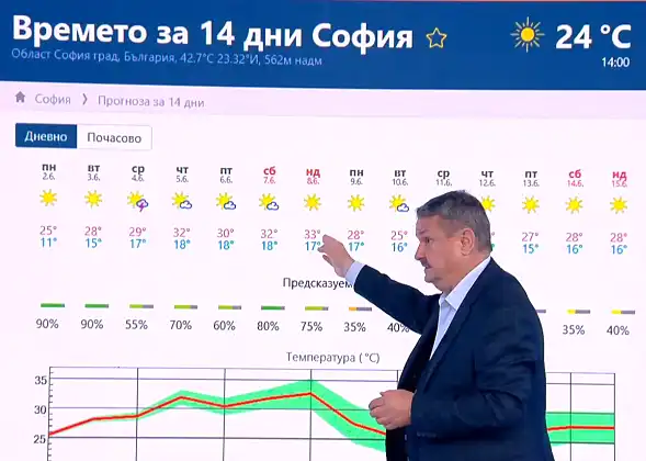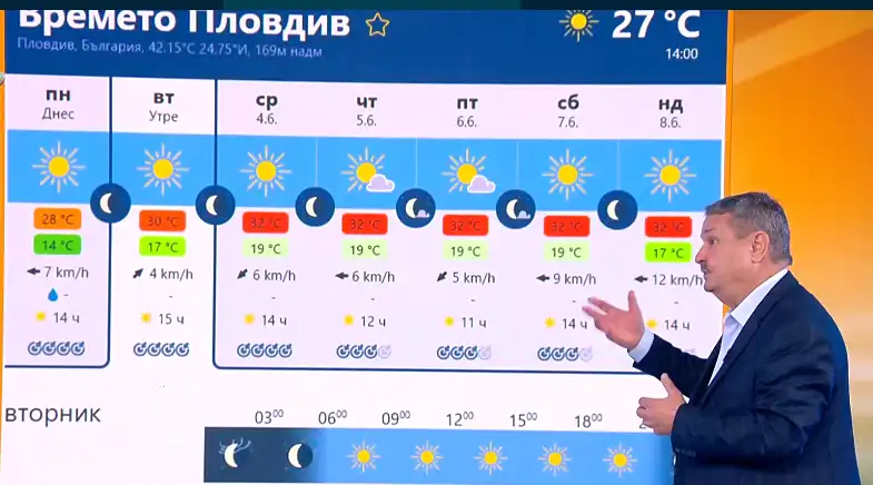 "Ванеса", която дъвчем вече цяла седмица, ще се задържи над нас може би около 5-6 дни още. Ужасно много слънце – то се видя и в София вчера, беше малко задушно. Но едно е август да е горещо, друго е юни. Така започна днешната си прогноза проф. Георги Рачев в ефира на bTV.