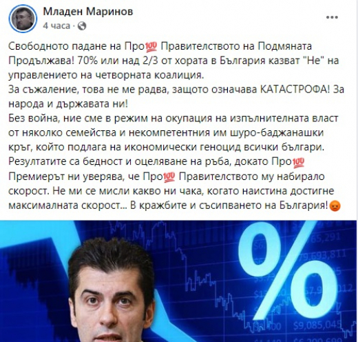 Бившият Министър на вътрешните работи на България от 20 септември 2018 до 24 юли 2020 г. Младен Маринов направи остър коментар на своя Фейсбук профил.