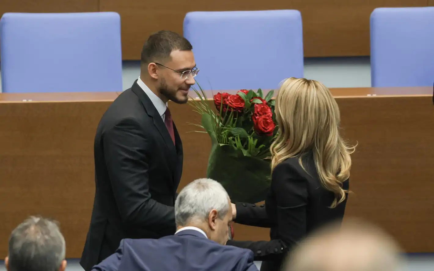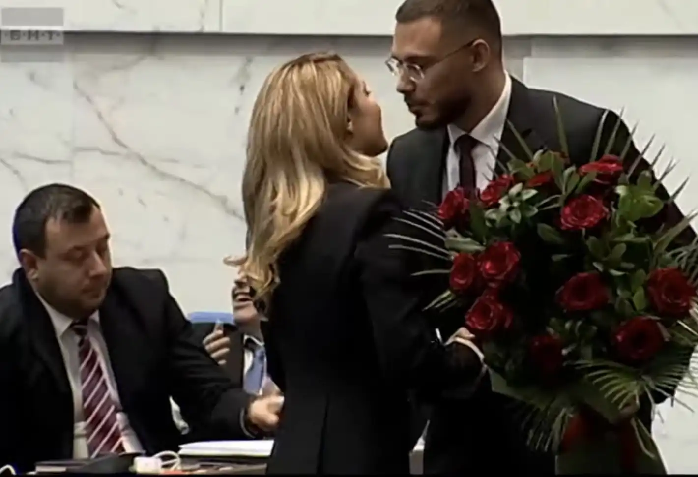 Малко преди да се качи и да седне на почетното шефско място, Назарян бе посрещната от Георги Кръстев (депутат от ГЕРБ и член на Правна комисия) , който й поднесе огромен букет с червени рози.
