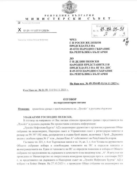 Това стана ясно, след като в отговор на разследване на "Политико", според което "Лукойл" са нарушавали ембаргото за износ на горива за страни от Европейския съюз и нежелание на правителството за предсрочното прекратяване на дерогацията, издействана от кабинета "Петков", през ноември 2023 г. Делян Пеевски внесе писмен парламентарен въпрос относно това кога и с кого от "Лукойл" са разговаряли Денков и началникът на кабинета му (виж официален документ долу - б.р.), както и за какво са се договаряли.