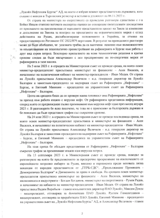 "Кирил Петков, Асен Василев и Денков са провели няколко срещи с висши представители на "Лукойл" - с Воробьов, с Александър Величков (заместник-председател на Надзорния съвет на рафинерията в Бургас) и голяма група хора в Министерски съвет, като тези срещи не са отбелязани в книгата за гости.
