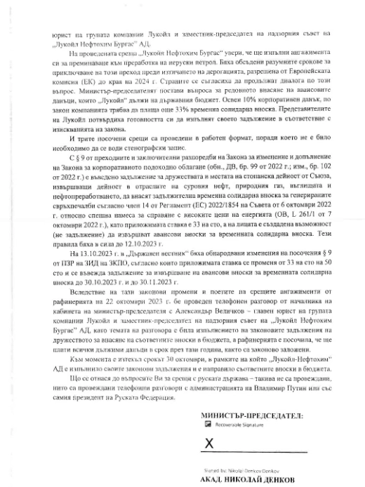 Между 5 юли и 13 септември, бившият министър-председател и членове на правителството "Денков" проведоха три срещи с представители на руската петролна компания. Доказателства за предмета на разговори помежду им обаче няма.