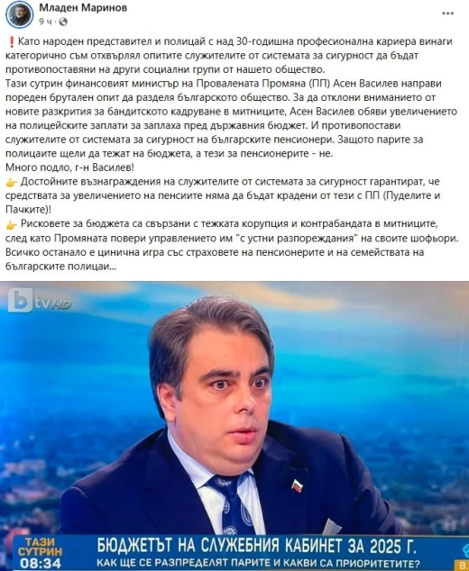 Бившият вътрешен министър и депутат от ГЕРБ-СДС Младен Маринов насмете подлото поведение и коментари на бившия финансов министър Асен Василев, който се опитва да противопоставя полицаи на пенсионери.