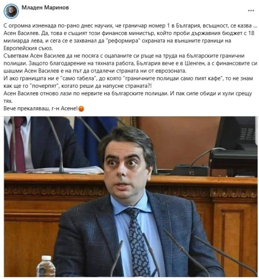 Бившият министър на вътрешните работи, а сега депутат от ГЕРБ Младен Маринов, публикува гневен пост във Фейсбук по повод петъчното изявление на Асен Василев, който поиска съкращаване на полицаи, за да има пари за МВР.