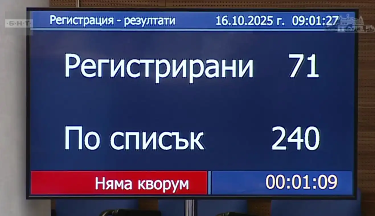 На днешното заседание - 16 октомври, кворум не беше събран. Липсата на днешния кворум в парламента стана факт буквално след минута. Регистрираха се едва 71 депутати. Председателят Наталия Киселова насрочи пленарното заседание за петък.