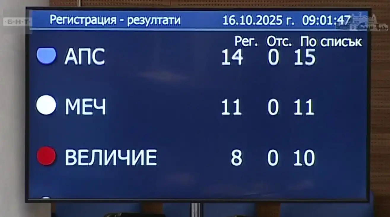 Най-много регистрирани депутати в залата имаше от ПП-ДБ - 29, АПС - 14, МЕЧ - 11, БСП - 9, "Величие" 8.