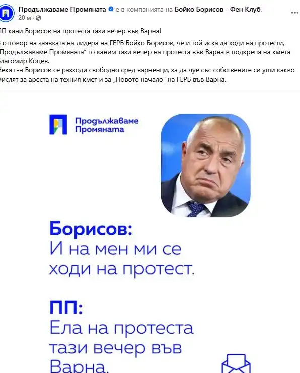„В отговор на заявката на лидера на ГЕРБ Бойко Борисов, че и той иска да ходи на протести, „Продължаваме Промяната“ го каним тази вечер на протеста във Варна в подкрепа на кмета Благомир Коцев.