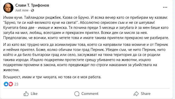 Лидерът на "Има такъв народ" Слави Трифонов излезе с пост в социалните мрежи. В съобщението си той вдигна завесата над личния си живот и призна какви домашни любимци има. Повод за думите му са протестите, които се провеждат заради садистите Габриела Сашова и Красимир Георгиев.