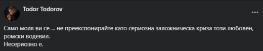 "Само моля ви се ... не преекспонирайте като сериозна заложническа криза този любовен, ромски водевил. Несериозно е" - категоричен бе той.