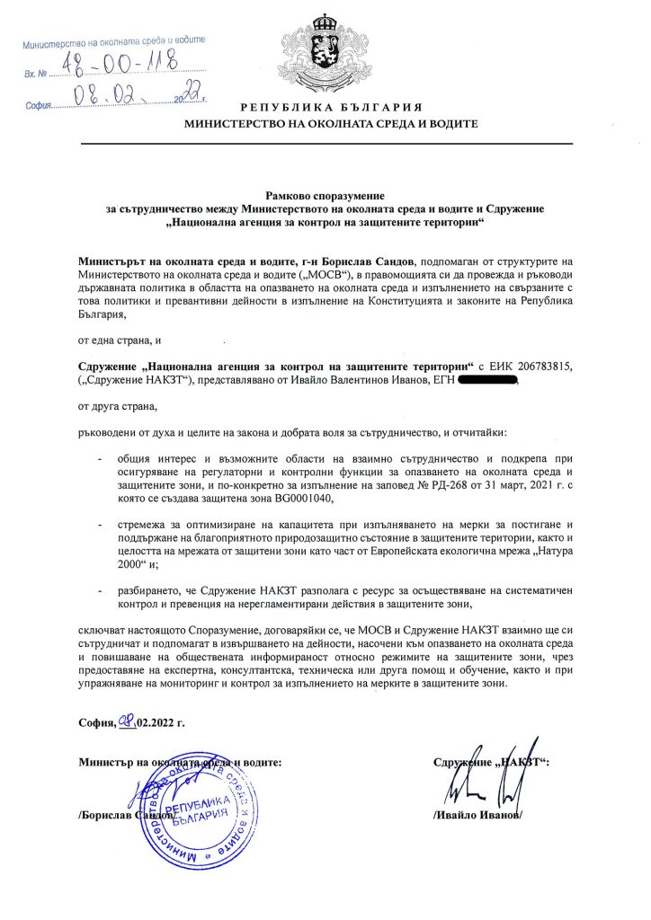 Споразумението е подписано лично от министъра на околната среда и водите и вицепремиер по климата Борислав Сандов