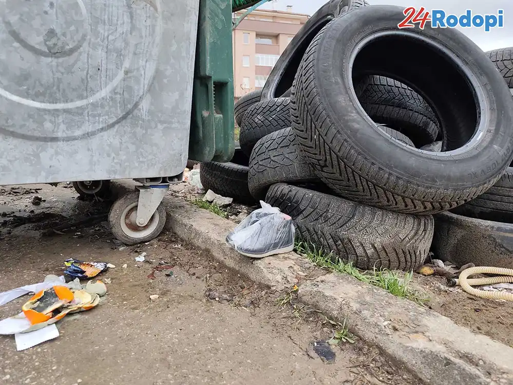 Детайл от всеобщата мизерия. Контейнер в Кърджали, натрупани автомобилни гуми, където не им е мястото. Но така е по-лесно.