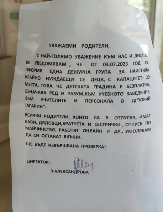 Родители от Годеч бяха посрещнати от странно съобщение, закачено на вратите на детска градина „Юрий Гагарин” в града. На бележката пише, че само крайно нуждаещи се деца ще могат да посещават детското заведение през летния сезон.