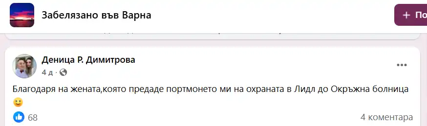 И неслучайно казахме, че доброто трябва да е заразно. За да покаже колко много значи понякога един жест, благодарната собственичка на портмонето описа ситуацията във фейсбук групата "Забелязано във Варна" - и за да благодари, и за да сподели радостта си от развоя на събитията.