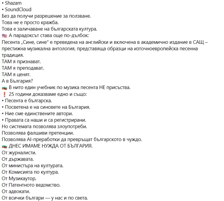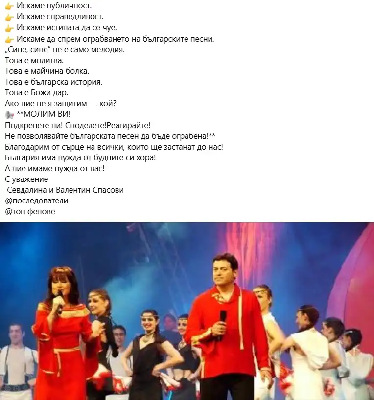 „Нима и днес трябва да мълчим? Боли да виждаме как българска песен, родена от душата на народа, се изопачава и продава от хора, които нямат нито едно право върху нея“, споделят изпълнителите в официалната си страница във Facebook.