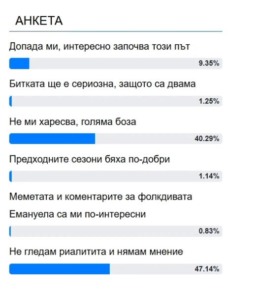 Според 1,14% от хората "Предходните сезони бяха по-добри", а 0,83% предпочитат "Меметата и коментарите за фолкдивата Емануела", защото ги считат за "по-интересни".