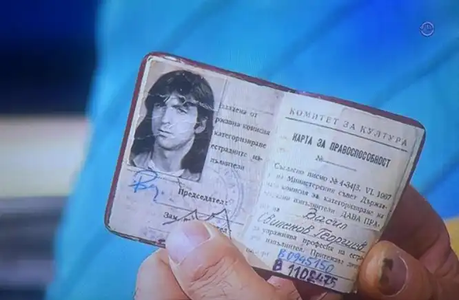 Блусарят Васко Кръпката подари на водещата Диана Любенова своята карта за трудоспособност на естраден изпълнител – официален документ от времето на социализма.