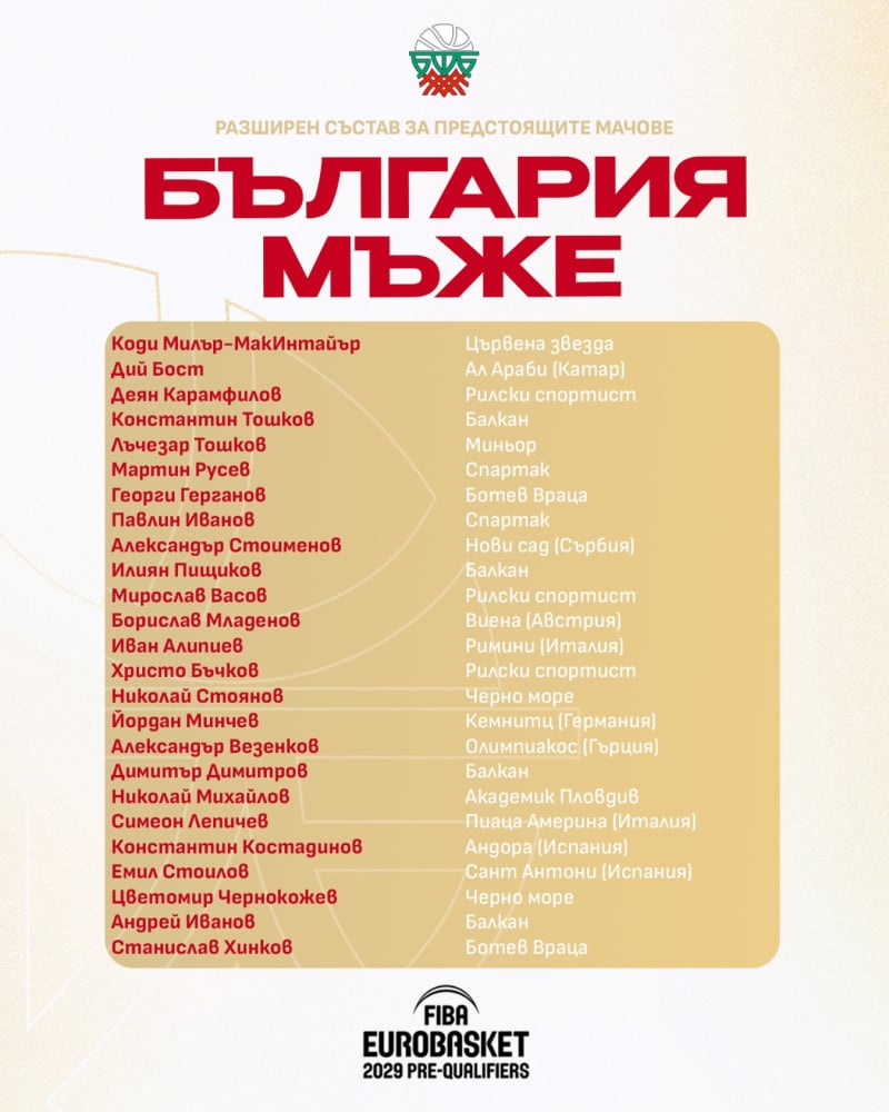 Общо 25 баскетболисти попаднаха в състава на мъжкия национален отбор на България за следващите предквалификационни срещи за Европейското първенство през 2029 година, съобщиха от Българската федерация по баскетбол. Най-добрият ни играч Александър Везенков, както и двамата натурализирани американски гарда Коди Милър-Макинтайър и Дий Бост, са сред избраниците на селекционера Любомир Минчев.