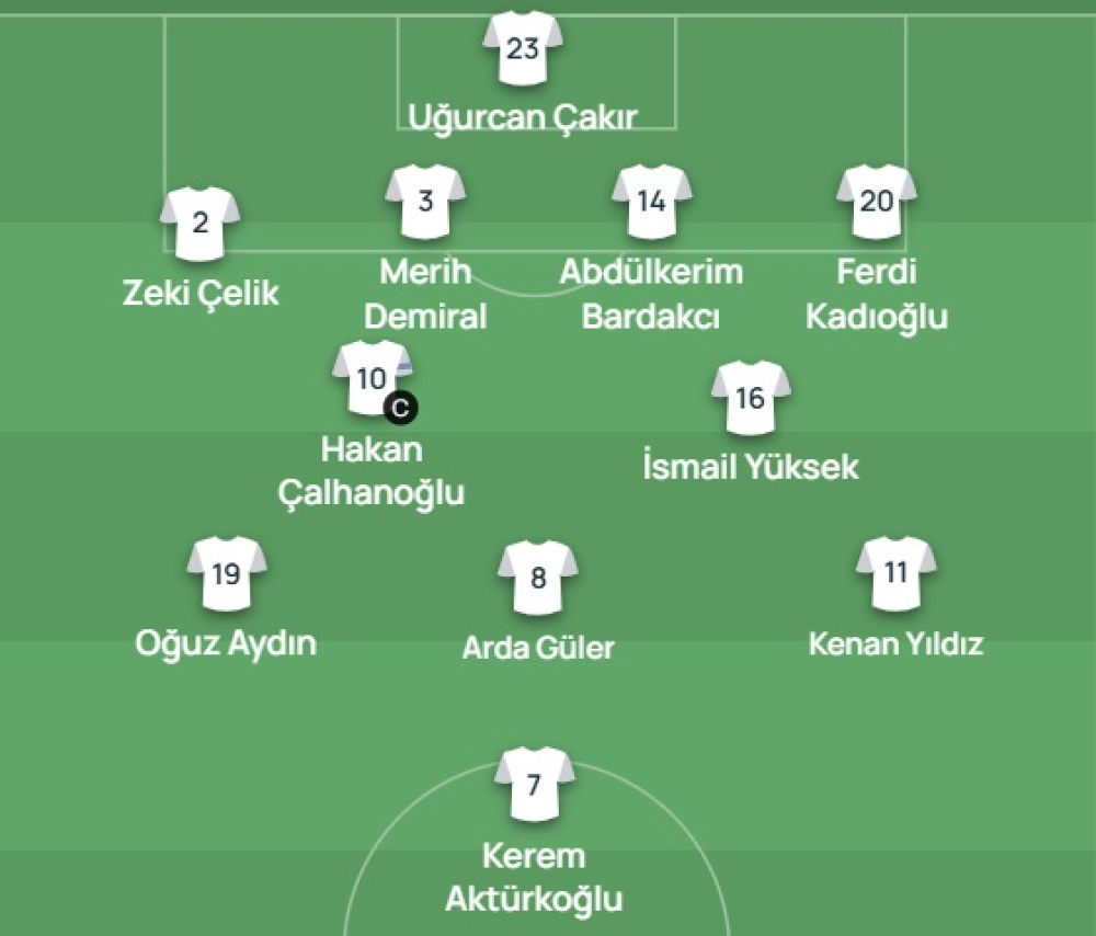 ТУРЦИЯ: 23. Угурджан Чакър, 2. Зеки Челик, 3. Мерих Демирал, 14. Абдюлкерим Бардакджъ, 20. Ферди Кадиоглу, 10. Хакан Чалханоглу (к), 16. Исмаил Юкшек, 19. Огюз Айдън, 8. Арда Гюлер, 11. Кенан Йълдъз, 7. Керем Актюркоглу