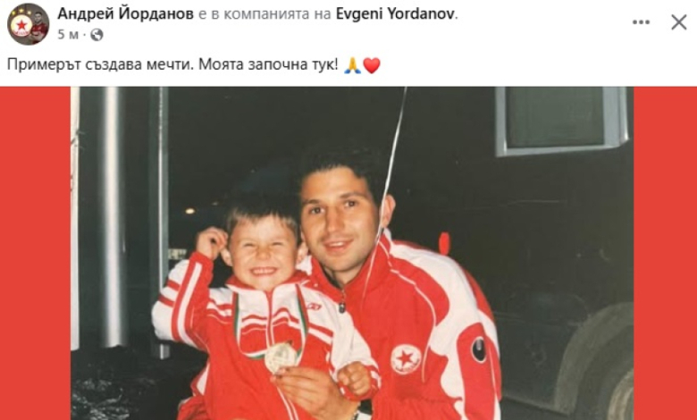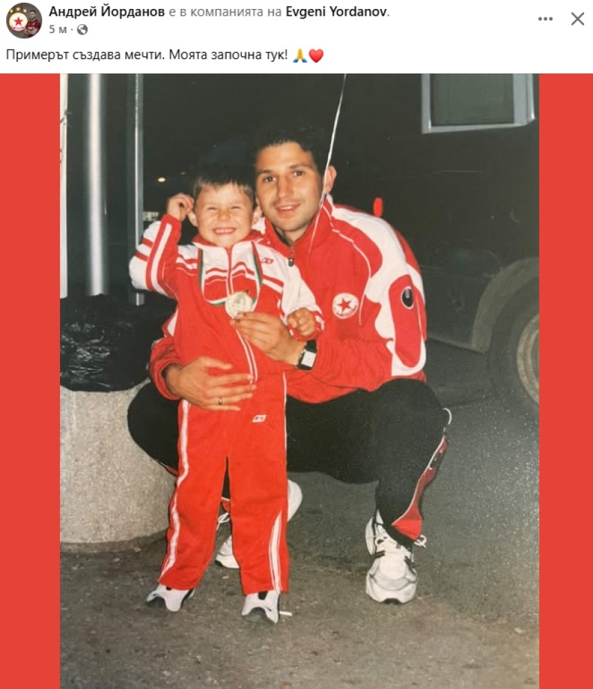 24-годишният футболист, родом от Кюстендил, който днес бе официално представен от "червените", сподели фото с чичо си - бившият таран на "армейците" Евгени Йорданов. На него тогавашният футболист на ЦСКА е гушнал невръстния Андрей, който е облечен в червен анцуг и с медал на врата. Евгени Йорданов - Гената е част от последните два шампионски тима на "червените". С ЦСКА е вдигал и Суперкупата на България.