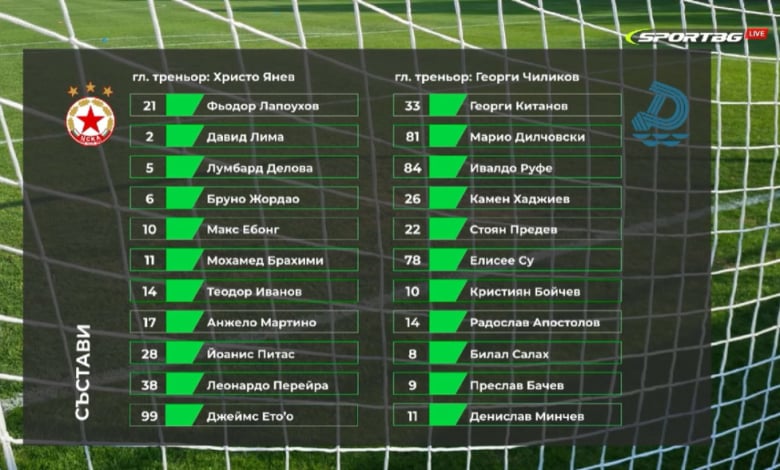 ЦСКА: 21. Фьодор Лапоухов (72’ 25. Димитър Евтимов), 2. Дейвид Пастор (72’ 19. Иван Турицов), 5. Лумбард Делова (77’ 91. Алекс Тунчев), 14. Теодор Иванов (46’ 4. Адриан Лапеня), 17. Анжело Мартино (72’ 3. Андрей Йорданов), 6. Бруно Жордао (к) (72’ 30. Петко Панайотов), 10. Макс Ебонг (62’ 94. Исак Соле), 99. Джеймс Ето’о (72’ 73. Илиан Илиев), 11. Мохамед Брахими (77’ 8. Дейвид Сегер), 38. Лео Перейра (77’ 7. Улаус Скаршем), 28. Йоанис Питас (62’ 9. Леандро Годой)