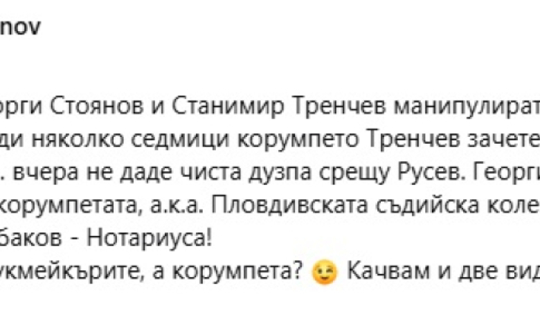 "Гнусните корумпета Георги Стоянов и Станимир Тренчев манипулират резултати от футболни мачове! Доказано! Преди няколко седмици корумпето Тренчев зачете гол, отбелязан след асистенция с две ръце… вчера не даде чиста дузпа срещу Русев.