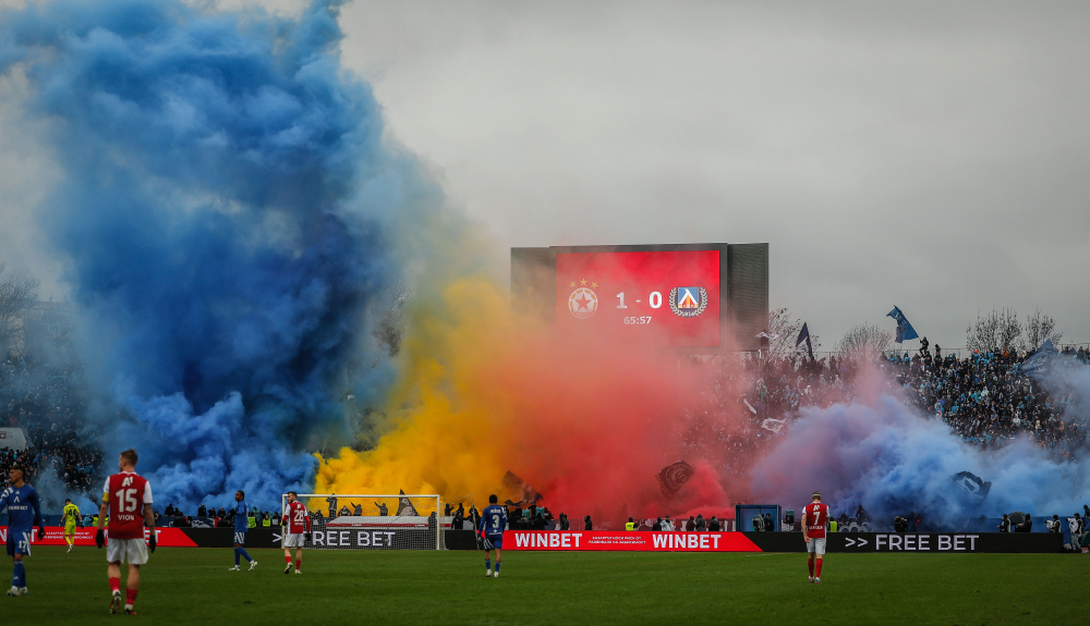 През второто полувреме от същата трибуна беше хвърлена и факла, което наложи спирането на играта.
