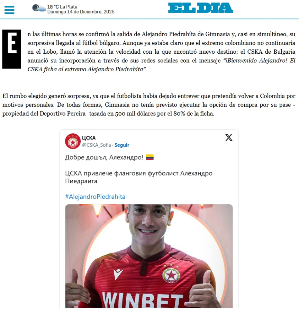 Трансферът на колумбийското крило Алехандро Пиедраита в ЦСКА предизвика изненада в Аржентина, където доскоро футболистът играеше за Химнасия (Ла Плата).