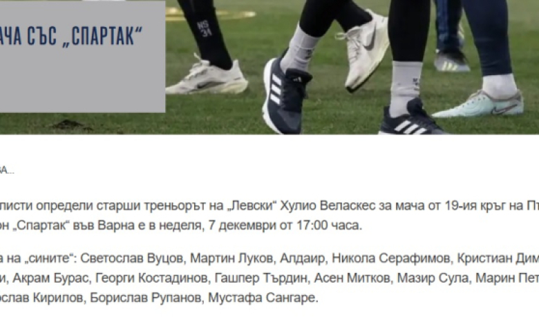 Треньорът на Левски Хулио Веласкес определи група от 20 футболисти за днешния мач срещу Спартак във Варна. Двубоят от 19 кръг на efbet Лига започва в 17:00 часа.