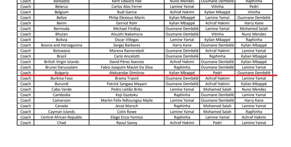 Вотът на селекционера на България Александър Димитров е различен. На първо място в анкетната карта на 49-годишния специлиаст е Мбапе. Втората позиция е за халфа на Барселона и Испания Педри, а Дембеле е на трето място.